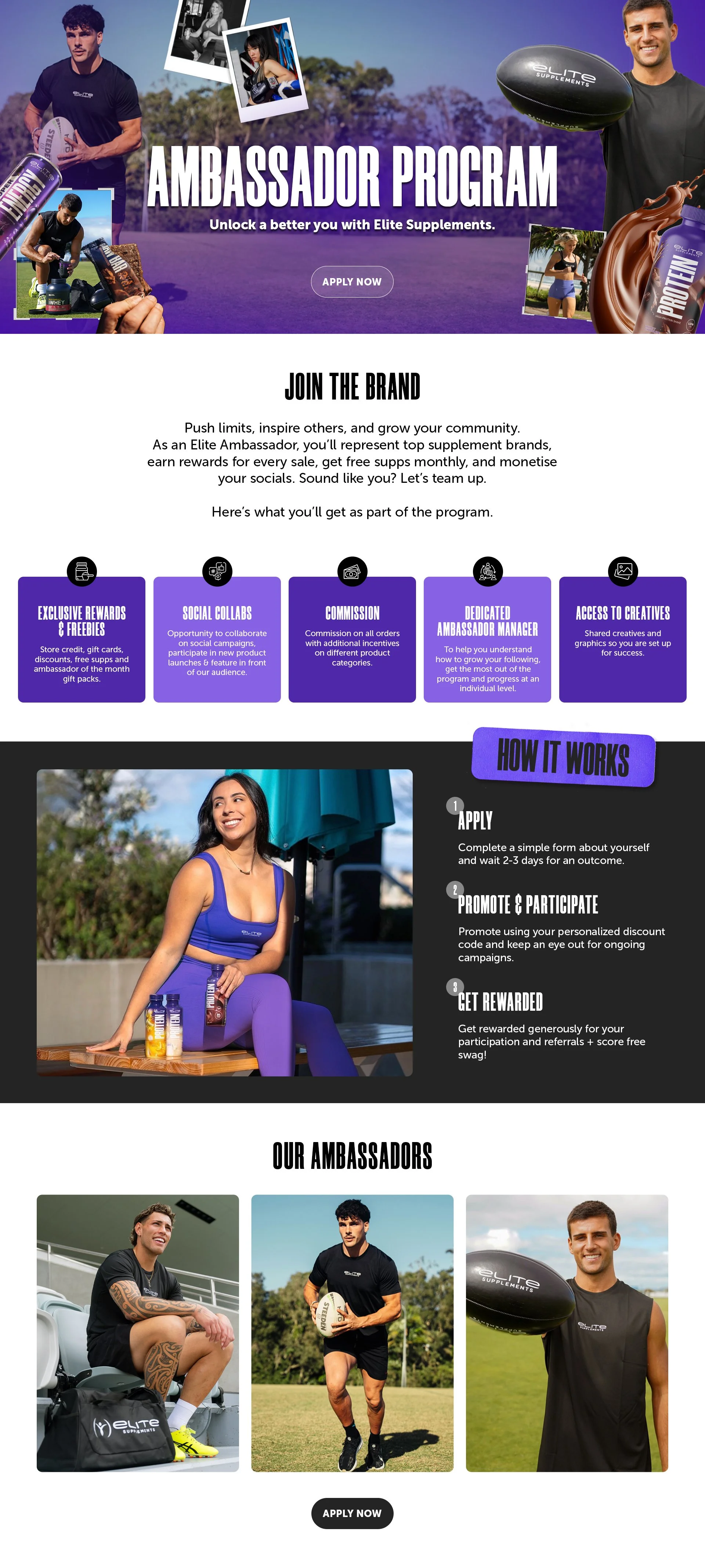 Objective: Create an engaging landing page to attract athletes and influencers to our ambassador program, showcasing benefits and simplifying the sign-up process to drive conversions.